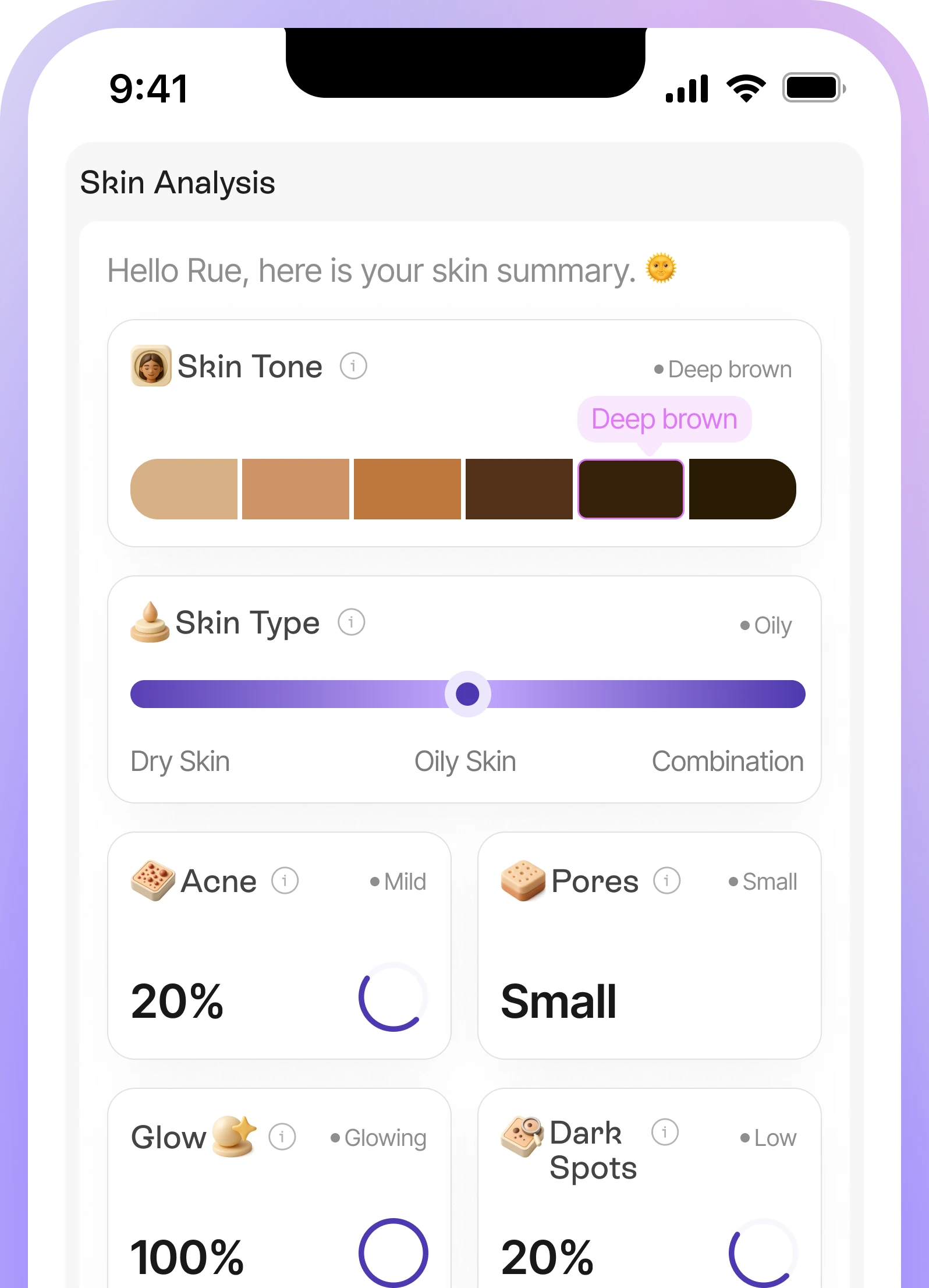 We don’t just scan your face. Oyster builds your full skin profile — skin type, skin concerns, hydration levels, sun exposure, climate data, and more.